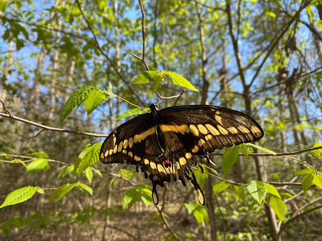 Like a little kid, I jumped out of my chair and chased it into the woods. Not only did she pause for a few pictures, she felt perfectly comfortable with me picking her up for a few moments (BTW: be sure to never touch a butterfly's wings - they are so delicate, you'll accidentally rub off their scales.)